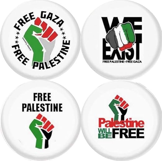 Express your solidarity with the Palestinian cause with this pack of 4 pin buttons featuring powerful images and logos. Each 58mm badge displays the colors of the Palestinian flag along with a raised grip, a symbol of resistance and unity. Bold designs include phrases like "Free Palestine", "Free Gaza" and "Palestine will be free," calling for support and freedom. These pins are perfect to wear on bags, jackets or accessories to show your attitude and raise awareness. Made of quality material, it is durable and eye-catching. Join the Palestinian liberation movement with these influential badges.