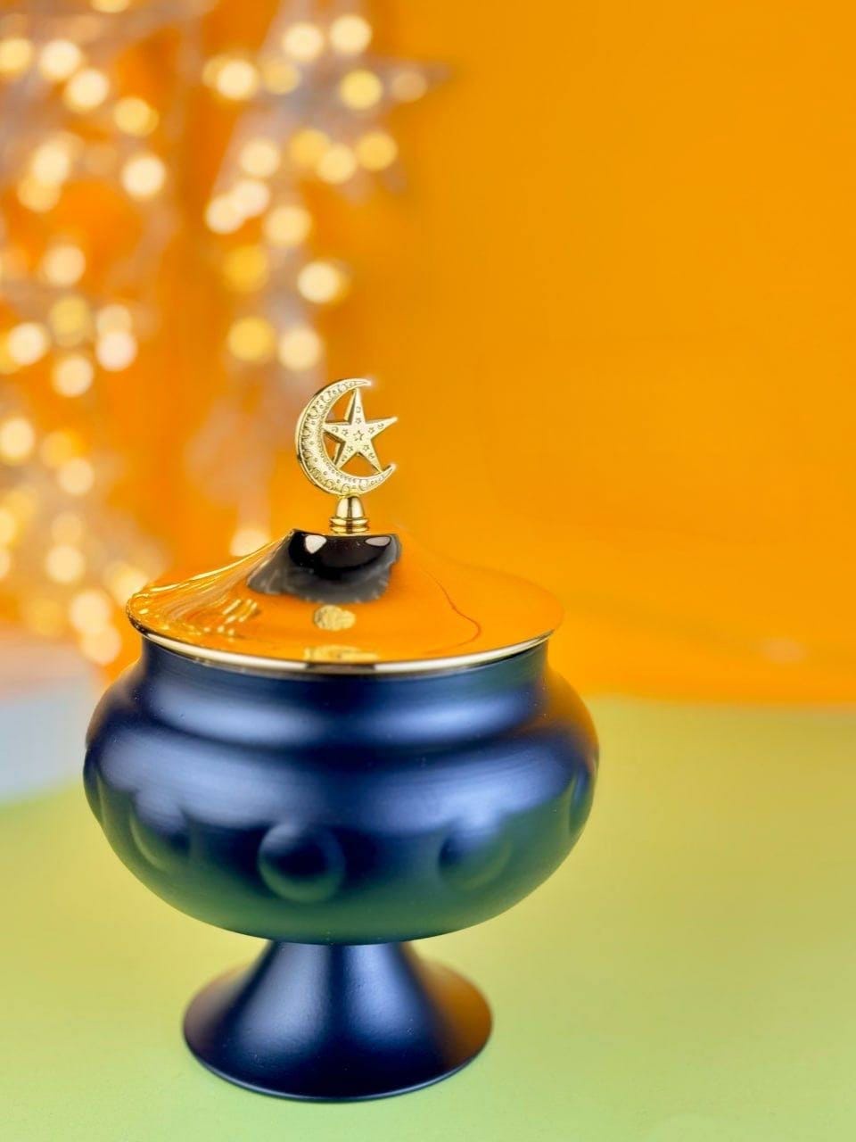 مبخرة رمضانية بتصميم راقي، لون غامق شيك مع غطاء ذهبي مزين بهلال ونجمة يدي لمسة فخامة واضحة. مثالية لاستخدام البخور وتعطير البيت في رمضان، وكمان قطعة ديكور مميزة تكمّل أجواء الشهر الكريم سواء في الريسبشن أو ركن القعدة.