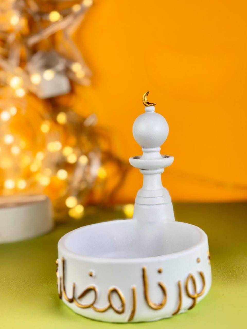 تمرية رمضان بتصميم أبيض راقي مزين بكتابة "رمضان مبارك" باللون الذهبي ولمسة هلال صغيرة في الأعلى تضيف طابع رمضاني مميز. قطعة أنيقة تناسب سفرة الإفطار وتدي شكل شيك ومرتب للمكان. مناسبة لتقديم التمر، المكسرات أو الحلويات الصغيرة، وكمان تعتبر ديكور جميل للبيت خلال الشهر الكريم.