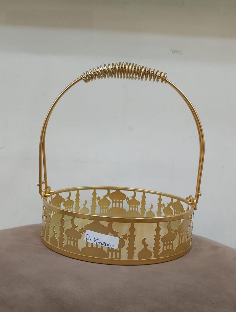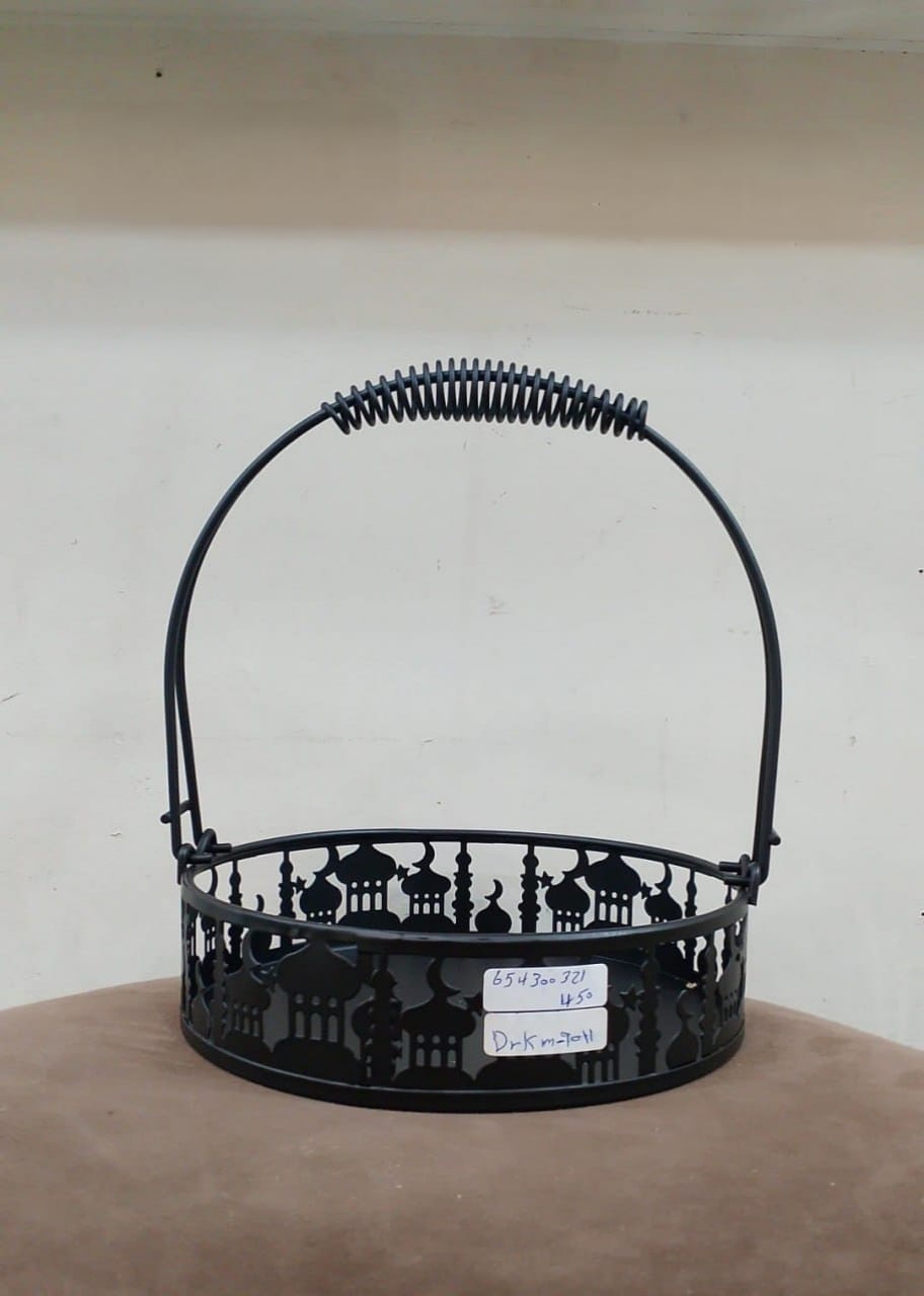 سلة تقديم معدنية بتصميم فوانيس رمضانية مفرغة، مع يد علوية مريحة للحمل. شكلها عصري وعملي في نفس الوقت، ومناسبة لتقديم التمر، العصائر الصغيرة، الحلويات أو حتى توزيعات رمضان. قطعة ديكور جميلة تضيف أجواء رمضانية مميزة لأي سفرة أو ركن في البيت.