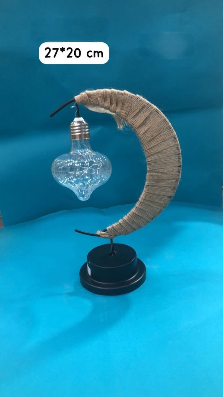 أباجورة مميزة بتصميم هلال أنيق ملفوف بخيوط طبيعية تعكس طابعًا دافئًا وعصريًا في نفس الوقت. يتدلّى منها مصباح زجاجي مزود بإضاءة LED ناعمة تضفي أجواء رومانسية وهادئة، مثالية لركن الضيافة أو طاولة جانبية في رمضان والمناسبات.
