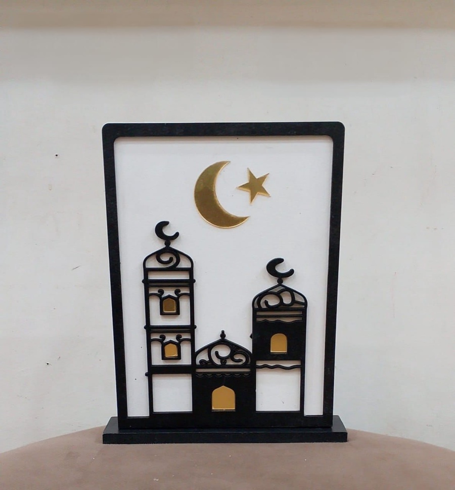 قطعة ديكور مميزة بتصميم مسجد داخل إطار مستطيل أنيق، تجمع بين اللون الأسود العصري والتفاصيل الذهبية الراقية. يتوسط التصميم هلال ونجمة باللون الذهبي ليعكس روح الشهر الفضيل، مع تفاصيل دقيقة تضيف لمسة فخامة وهدوء لأي ركن في المنزل.