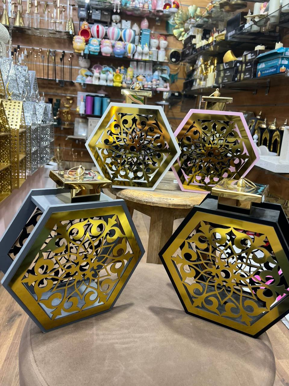 فانوس ديكور بتصميم سداسي عصري يجمع بين الإطار الملون الأنيق والزخارف الذهبية المفرغة بتفاصيل دقيقة.