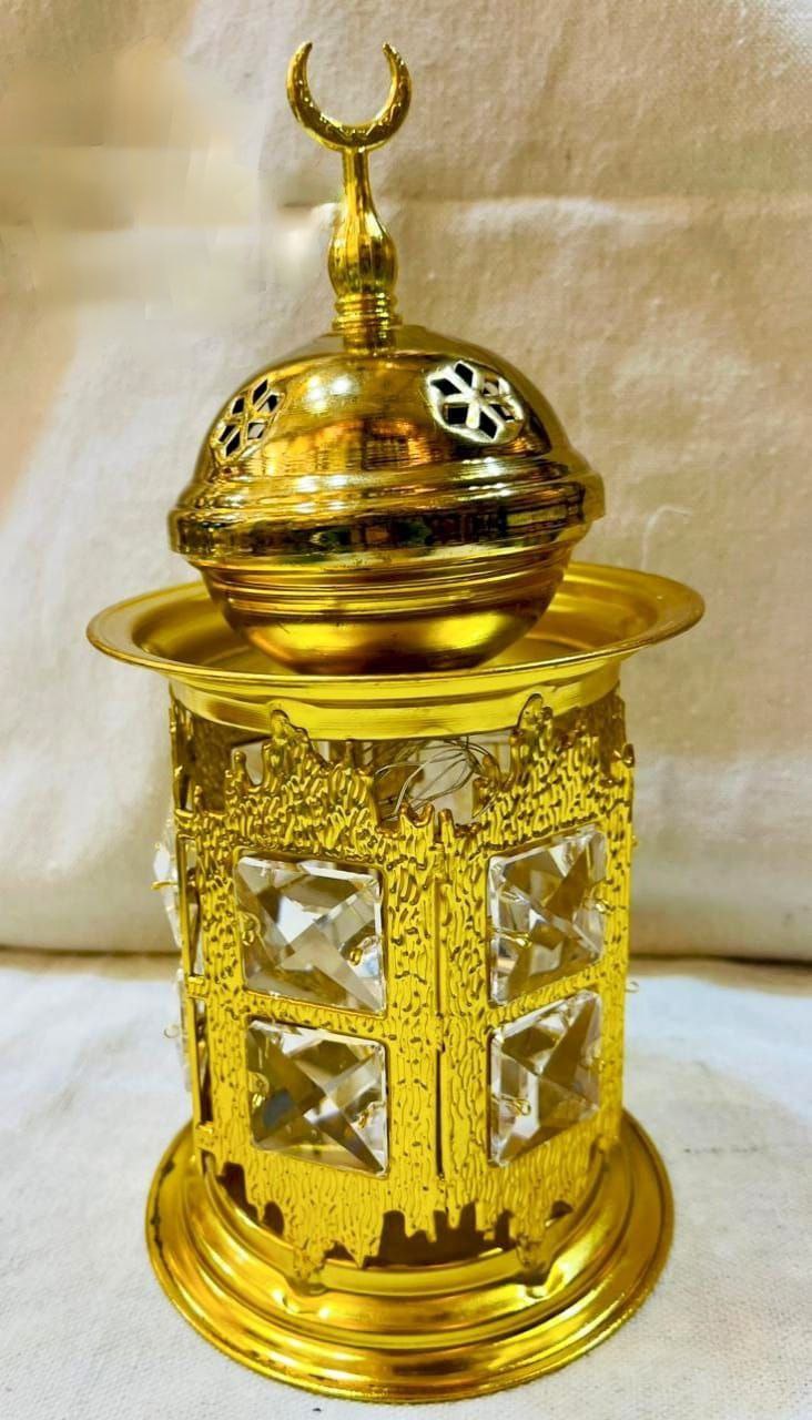 مزود بمبخرة علوية بغطاء أنيق يتوسطه هلال ذهبي، مع جسم مزخرف مزين بفصوص كريستالية تعكس الضوء بشكل ساحر.