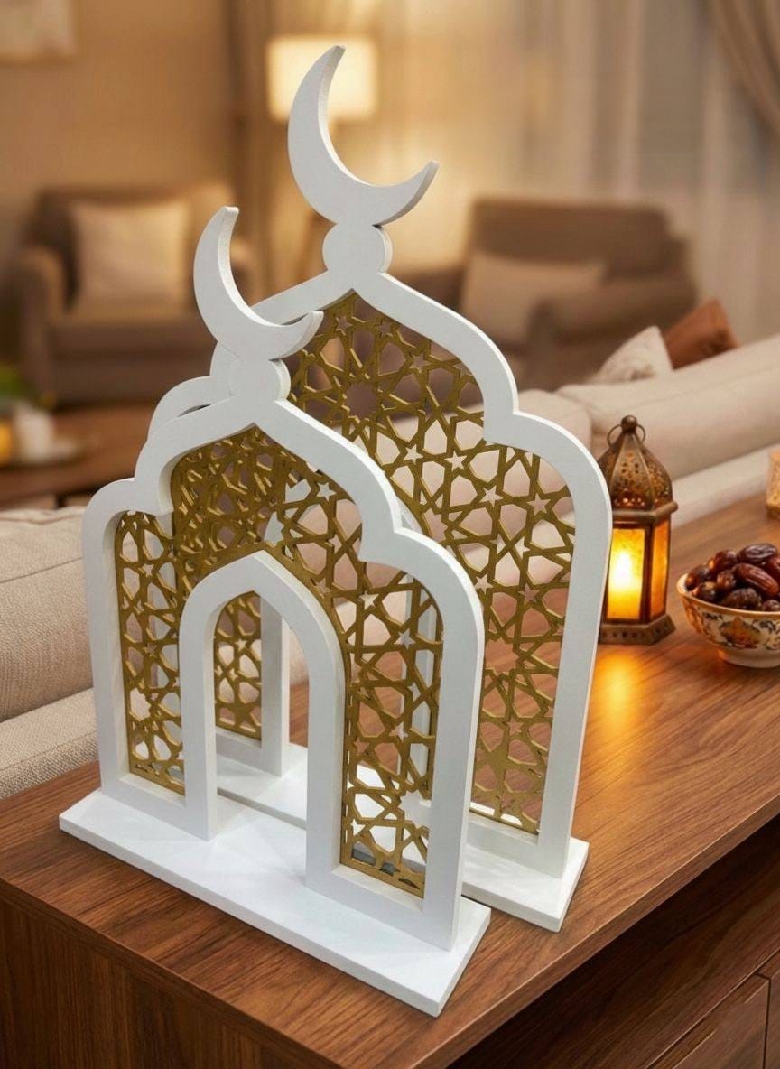 استقبلي الشهر الفضيل بأناقة مع طقم مجسمات المساجد الخشبية بتصميم راقٍ يجمع بين اللون الأبيض الناعم والتفاصيل الهندسية الذهبية اللامعة. التصميم مستوحى من العمارة الإسلامية بقبة وهلال علوي يرمز لأجواء رمضان الروحانية. مثالي لتزيين طاولة الإفطار، الكونسول، أو ركن الضيافة ليمنح المكان طابعًا دافئًا ومميزًا.