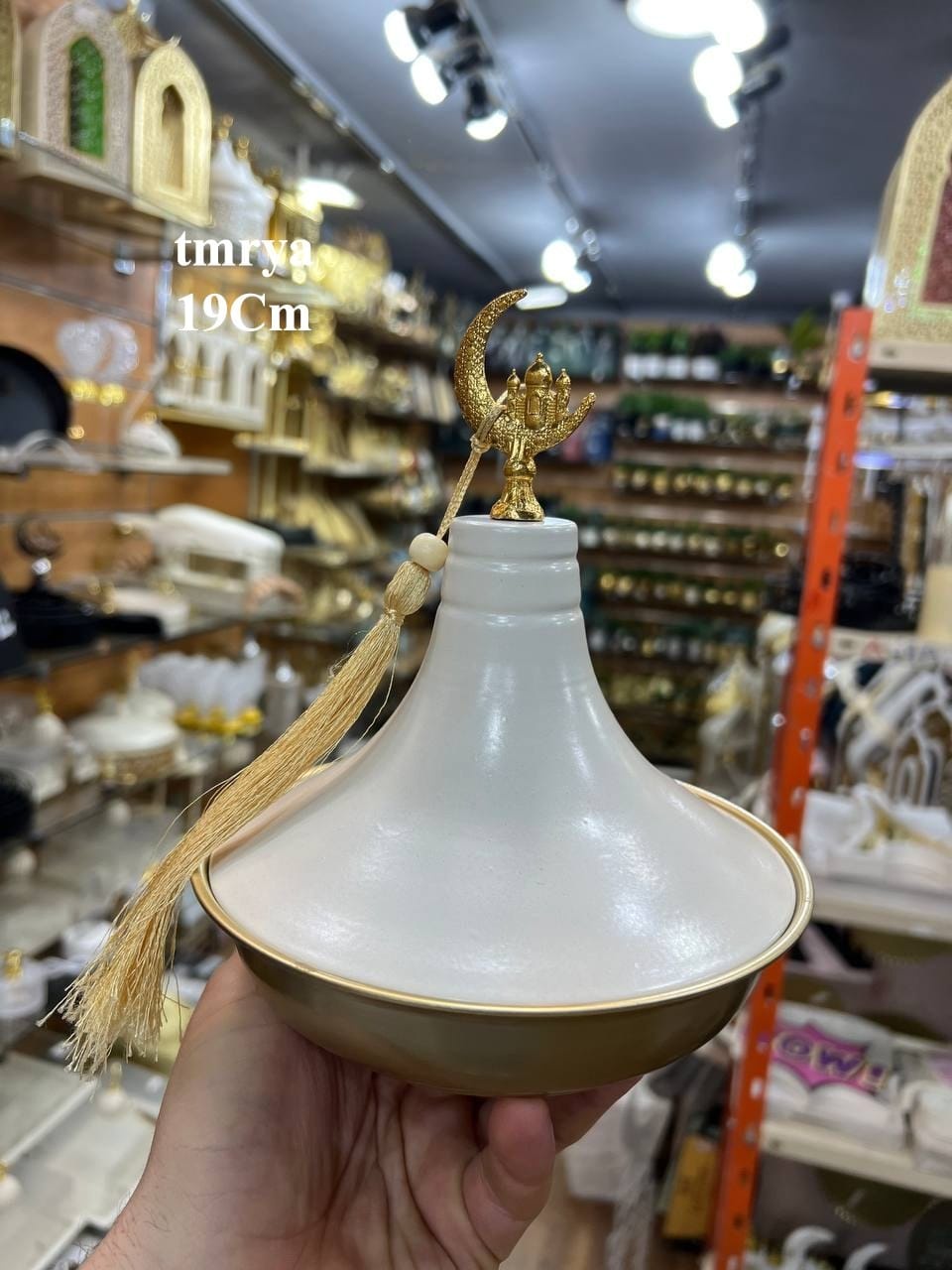 مبخرة أنيقة بتصميم مستوحى من الطراز الإسلامي الراقي، تجمع بين اللون الأبيض الناعم والقاعدة الذهبية اللامعة، مع غطاء مخروطي يتوّجه هلال مزخرف بتفاصيل فاخرة. مزودة بشرّابة ذهبية تضيف لمسة كلاسيكية مميزة، لتكون قطعة ديكور وعطر في آنٍ واحد.