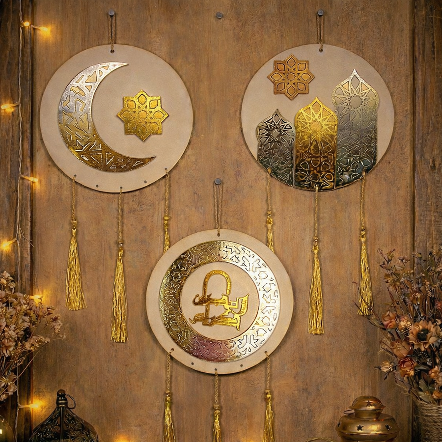 طارة حائط بتصميم دائري أنيق وزخارف إسلامية مستوحاة من روح رمضان، ألوانها هادية ولمعتها بسيطة بتدي إحساس دافي وراقي. مناسبة لمدخل البيت، الريسبشن أو ركن العبادة، وتكمل أي ديكور رمضاني بذوق عالي.