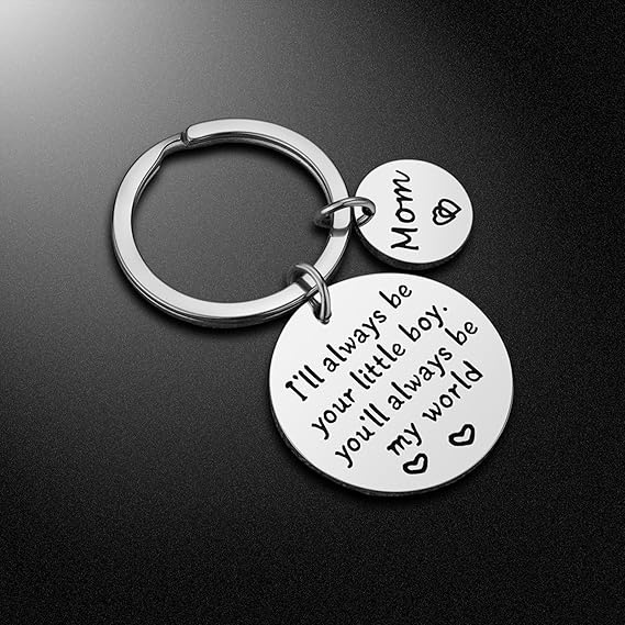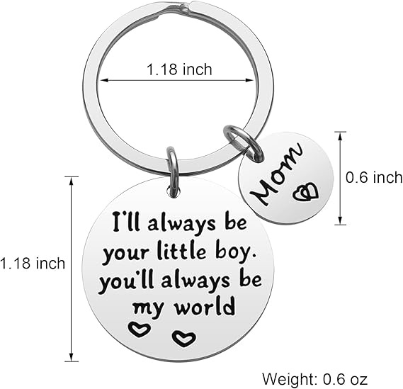 Double Sided Design - this keychain front engraved with " I'll Always Be Your Little Boy, You Will Always Be My World " words, and the back with " Best Mom Ever " words.