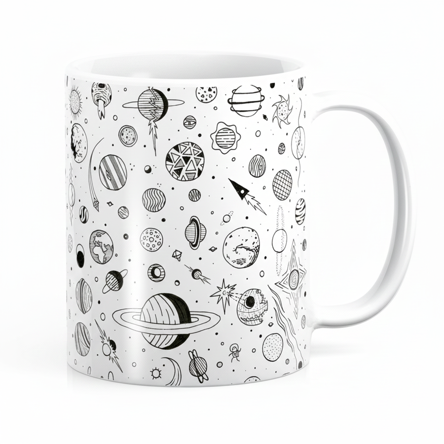 A stunning space-themed mug featuring an artistic black-and-white illustration of planets, stars, and galaxies. Perfect for space lovers, sci-fi fans, and anyone who appreciates unique artistic designs. Made from high-quality materials and ideal for all hot beverages such as coffee, tea, or hot chocolate. The durable print ensures long-lasting clarity, making this mug a great daily-use item or a thoughtful gift for astronomy enthusiasts.
