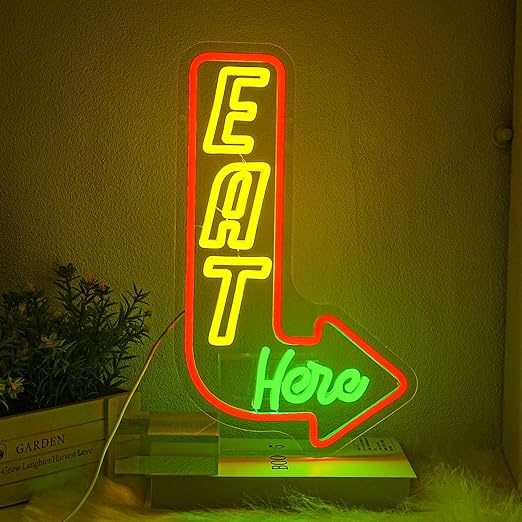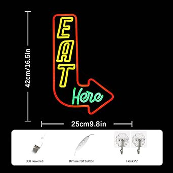 لوحة نيون مضيئة بتصميم Eat Here – تعمل بوصلة USB ✨💡