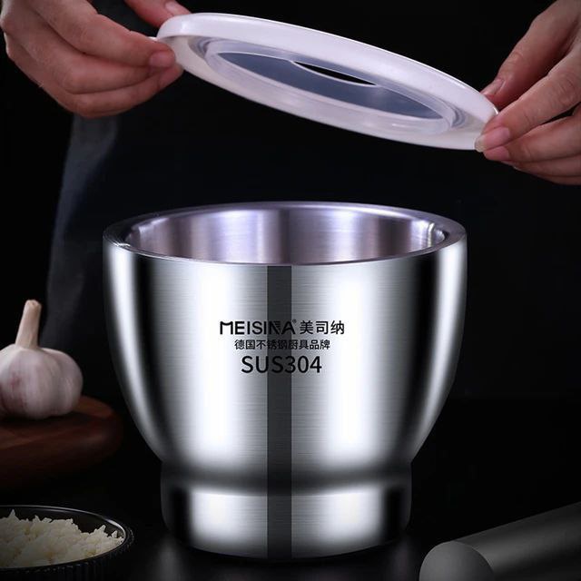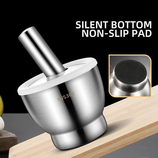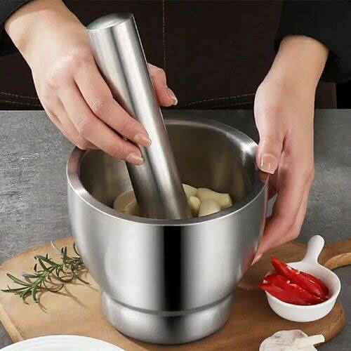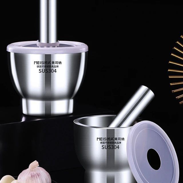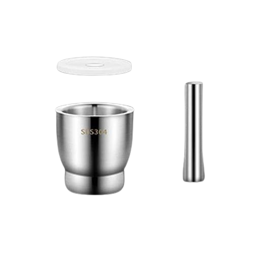 The SM4U stainless steel mortar and pestle set is designed for efficient grinding of spices, garlic, herbs, and seeds. Made from thick, durable stainless steel, it ensures long-lasting performance and easy cleaning. The included lid prevents spills and keeps ingredients contained while crushing. Perfect for home kitchens, chefs, and anyone looking for a modern, hygienic grinding tool.