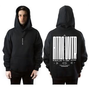A trendy men’s hoodie made from soft and durable fabric for everyday comfort. It comes in a sleek black color with bold white graphic prints on the back and a minimal vertical print on the front. The design combines modern streetwear aesthetics with a relaxed fit and adjustable hood, making it perfect for casual outings or urban looks.
