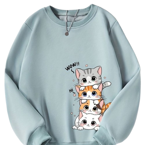 Stay cozy and adorable with this cute oversized sweatshirt featuring a stack of cartoon kittens and playful text like “WOW!!” and “Hi.” The soft pastel-blue color adds a calm and stylish touch, while the charming cat illustration makes it perfect for cat lovers and anyone who enjoys cute, cozy fashion.