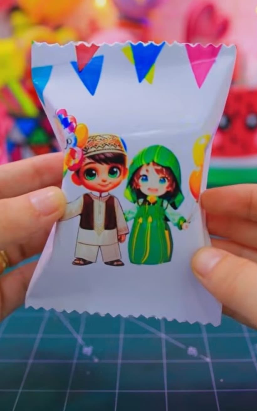 علب توزيعات بتصميم كرتوني لطيف لأولاد وبنات بملابس العيد، تضيف لمسة فرحة وبهجة لأي توزيعات.