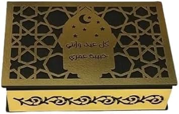 علبة هدية خشبية بتصميم عربي أنيق محفور عليها عبارة “كل عيد وأنتِ حبيبة عمري” مع زخارف جميلة تعكس أجواء العيد. مثالية لتقديم الهدايا أو حفظ الإكسسوارات بطريقة راقية تضيف لمسة فخامة لأي هدية.