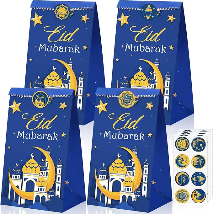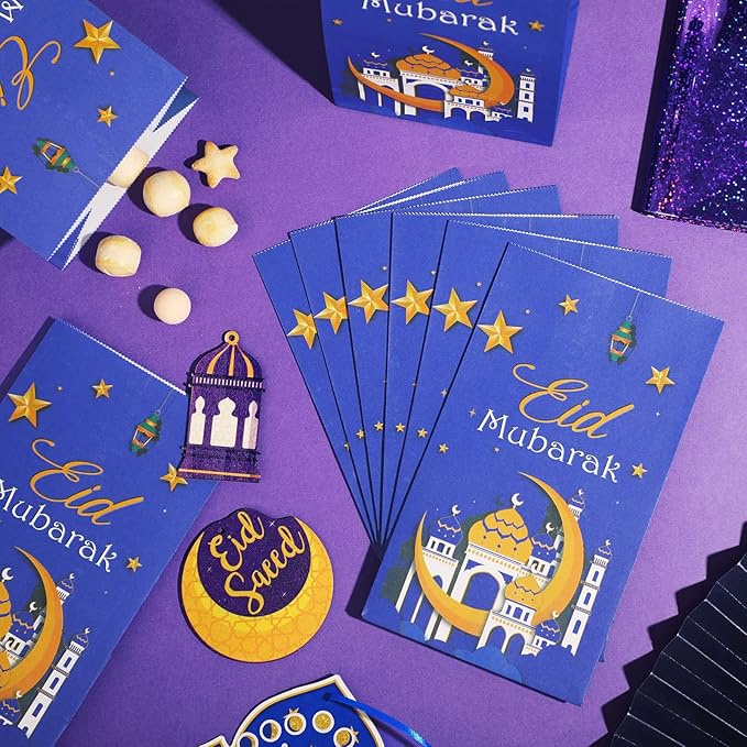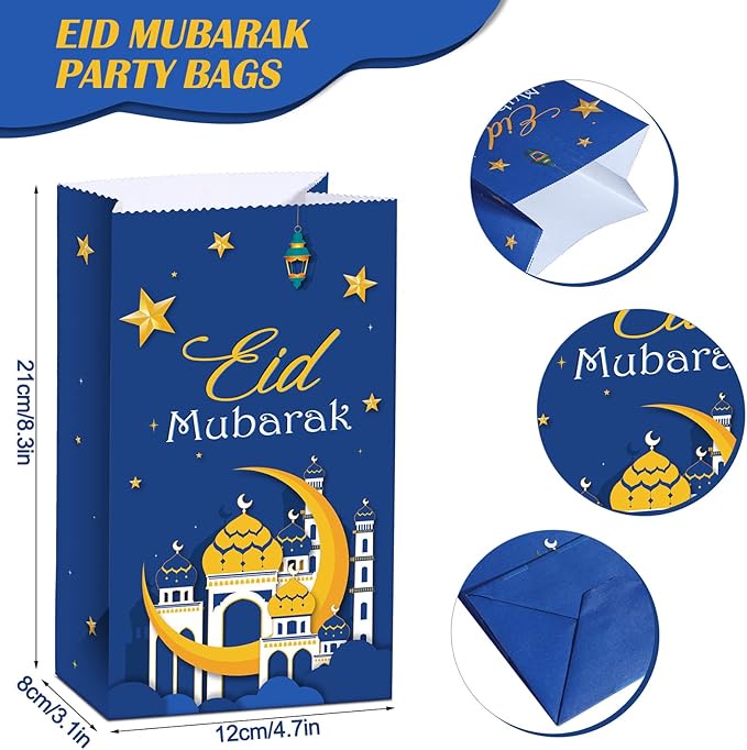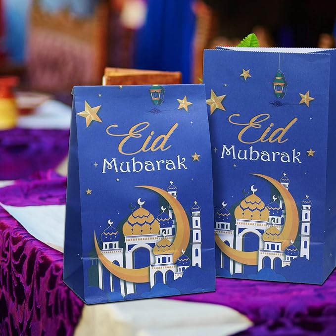شنط توزيعات بتصميم مميز مكتوب عليه "Eid Mubarak" مع رسومات هلال ومسجد ولمسات ذهبية أنيقة تعكس أجواء العيد.