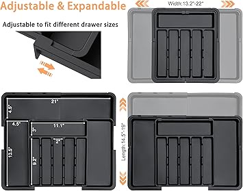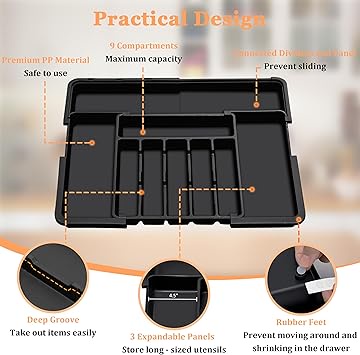 منظم أدراج عملي مصنوع من البلاستيك المتين، مصمم بتقسيمات متعددة لترتيب الملاعق والشوك والسكاكين وأدوات المطبخ بسهولة. يساعدك على استغلال مساحة الدرج بشكل أفضل ويحافظ على المطبخ مرتبًا ومنظمًا.